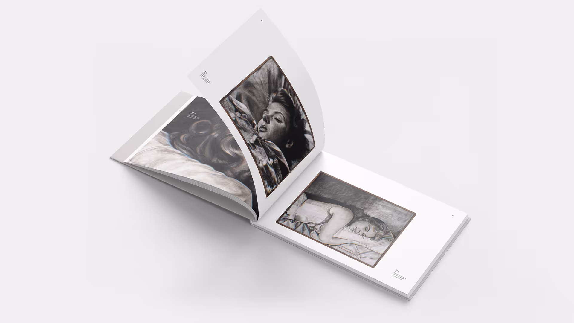Mijn eerste ontwerp had een staand formaat, geïnspireerd op een boek dat Nina zelf eerder had uitgebracht. Maar na wat tests (hoeveel werken per pagina, hoe om te gaan met detailfoto’s op groot formaat) kwamen we er al snel achter dat een liggend formaat beter zou werken. Het paste simpelweg beter bij Nina’s werk. Je wil haar kunst van dichtbij bekijken. De grootte, de textuur van het houtskool, dat komt moeilijk over op papier. De uitdaging was dan ook om de werken goed tot hun recht te laten komen, zonder dat het ontwerp zelf teveel aandacht opeist. Met het liggende formaat kon ik meer witruimte gebruiken om het geheel rustig te houden. Door af en toe detailfoto’s anders te plaatsen of juist beelden over de hele breedte te laten lopen, probeerde ik het boek visueel interessant te houden.
